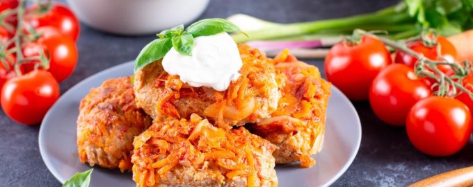 Vse skupaj premešajte, da se zmes dobro zlepi. Če razpade, vmešajte dodatno jajce. Z mokrimi rokami oblikujte polnjeno zelje, ga pomočite v moko in ocvrite v olju, da se na obeh straneh zapeče. Položite jih v ponev z debelim dnom. Paradižnikovo pasto zmešajte s kislo smetano in dodajte vročo vodo, da omaka spominja na tekoči kefir. Začinimo jo z začimbami in jo vlijemo v nadevano zelje. Če jih omaka ne prekrije 90 %, dodajte še malo vode.